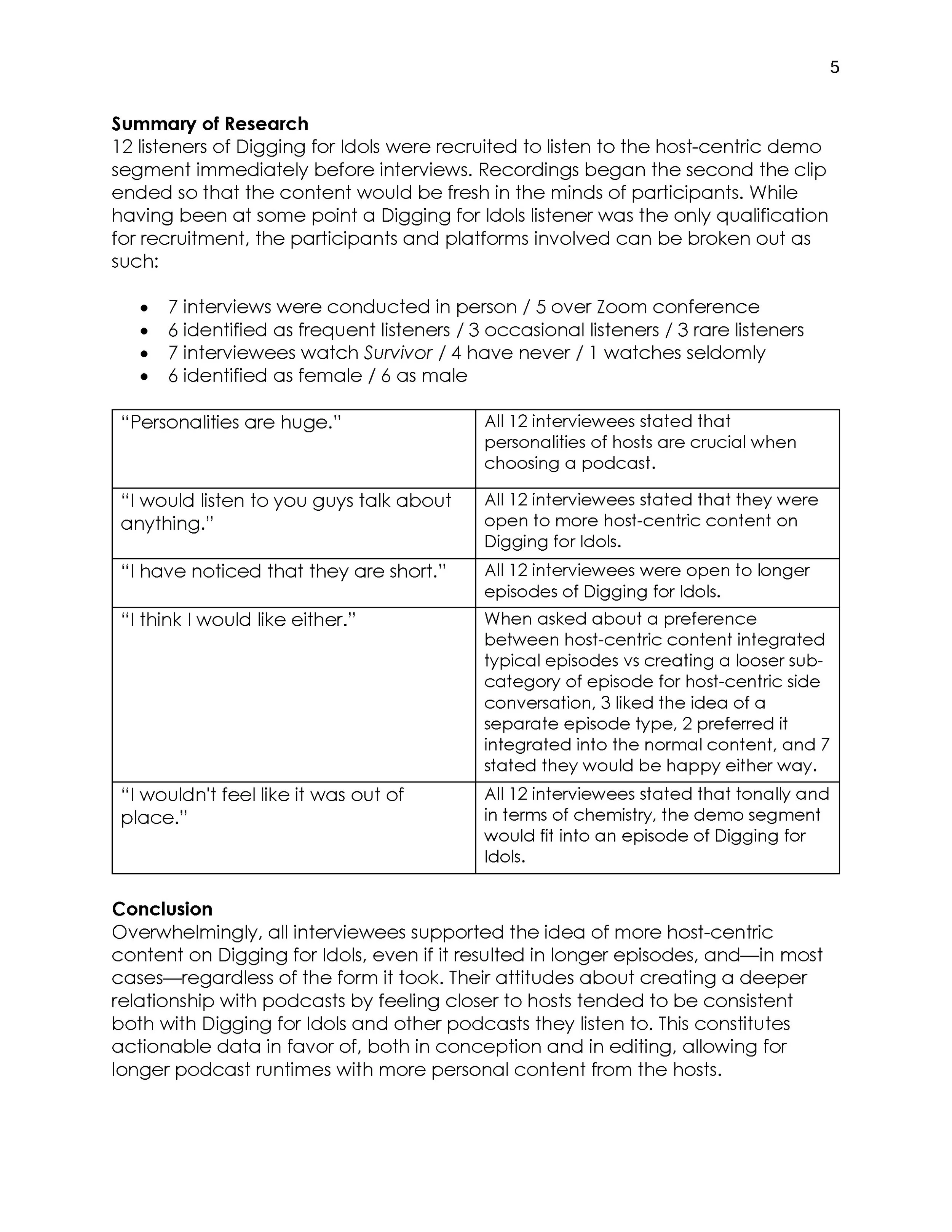 This market research piece was created for Digging for Idols, a podcast that I produce and co-host. It was also created as my semester project for COMSTRAT 565 - Professional Marketing Communication Management and Campaigns, as part of the Strategic Communications MA program at Washington State University’s Edward R. Murrow College of Communication. The course centered on the use of theory and research to guide communications campaign decisions. For it, I conducted twelve interviews with confirmed Digging for Idols listeners. During each, I presented them with a sample of unaired audio from the podcast to gauge interest in new avenues of subject matter for the podcast, followed by a draft of a Digging for Idols poster to measure the clarity of and demand for an innovative design as potential podcast merch. I analyzed the interview results qualitatively and draw conclusions as written in the report, which includes transcripts of all twelve interviews. In addition to demonstrating course knowledge, it was applied practically in podcast production to guide the show’s approach to pacing and editing moving forward.